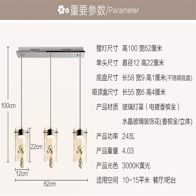 歐普照明 裝飾餐廳吊燈 精美玻璃燈壁 三頭餐吊燈 晨曦