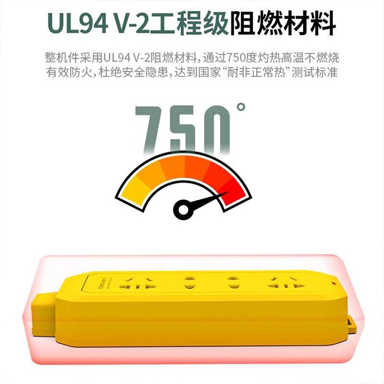 插座整機件采用UL94 V-2阻燃材料,通過750度灼熱高溫不燃燒