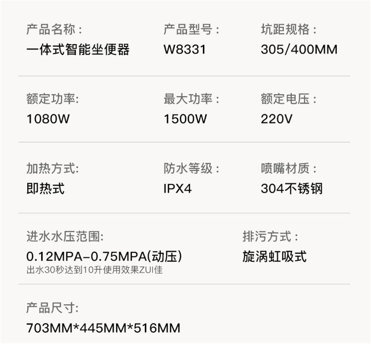 即熱式自動沖洗烘干家用馬桶坐便器 W8331