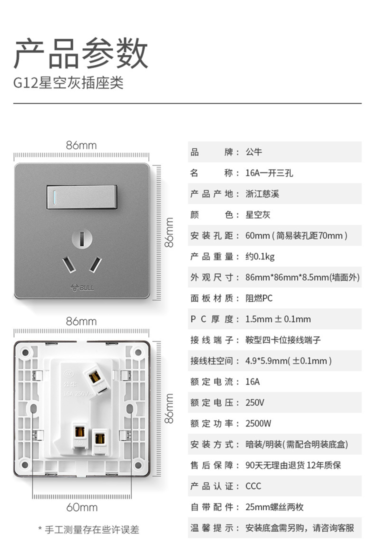 三孔3孔帶開關面板86型公牛品質 內外兼修