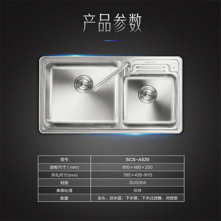 櫻花SCS-A520水槽廚房S304不銹鋼水槽洗菜盆單槽帶支撐架子大小洗碗臺(tái)盆手盆池產(chǎn)品參數(shù)