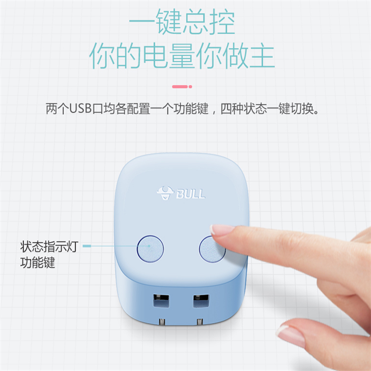 公牛自動防過充USB充電器兩個USB口均各配置一個功能鍵,四種狀態(tài)一鍵切換,你