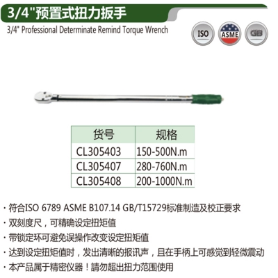 長鹿?3/4寸預置式扭力扳手19mm接口雙刻度尺高精度工具江蘇華東供應鏈管理有限公司